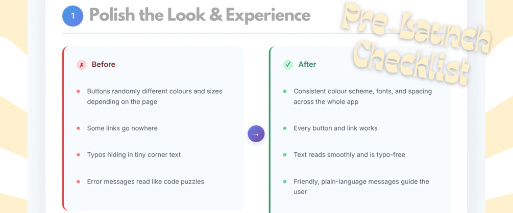 Ensure your application is polished, secure, and ready for your users with this pre-launch checklist. It covers tips from polishing the look and feel to securing your secrets and finalising authentication, all with clear 'before' and 'after' examples. Ship your application with confidence!